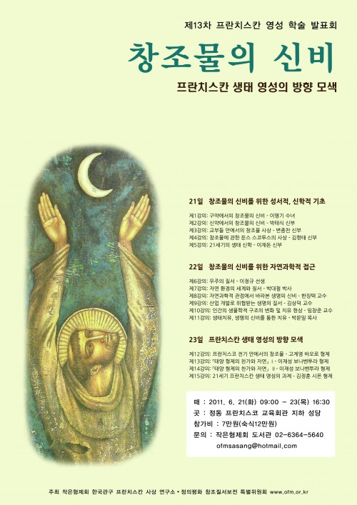 2011년도 프란치스칸 영성 학술 발쵸회는 "창조물의 신비"를 주제로 프란치스칸 생태 영성과 방향을 모색하면서 <프란치스칸 사상 연구소>와 <정의 평화 창조 질서보존 특별 위원회>가 공동으로 개최합니다.