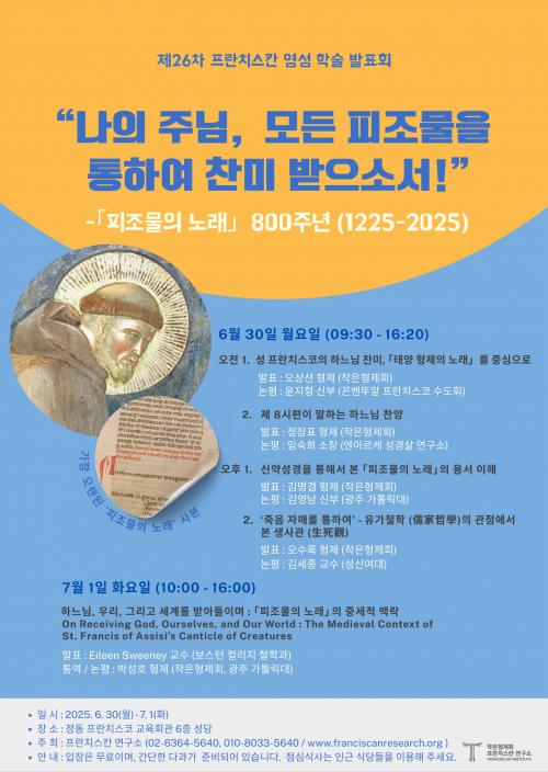 「피조물의 노래 」가 성인의 손에서 탄생한 지 800주년이 되는 올해를 기해서 프란치스칸 연구소는 다양한 신학적 철학적관점을 더해 이 노래를 더욱 풍요롭게 불러보는 제26차 프란치스칸 영성 학술 발표회를 준비합니다.